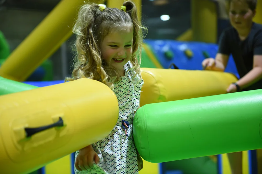 Each venue is loaded with a huge variety of inflatables — think giant slides, obstacle courses, bounce houses, climbing walls, fun obstacle challenges, and more. Kids can roam free for a full two-hour session, bouncing, sliding, running, and exploring until they’re ready to crash (in the best possible way).