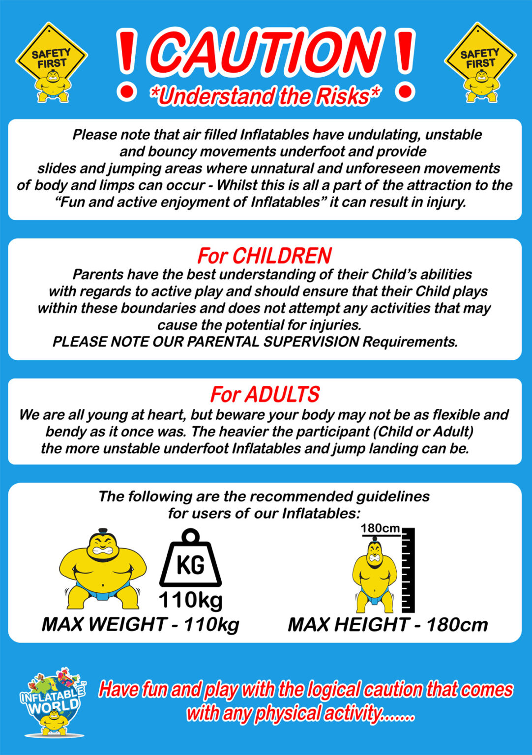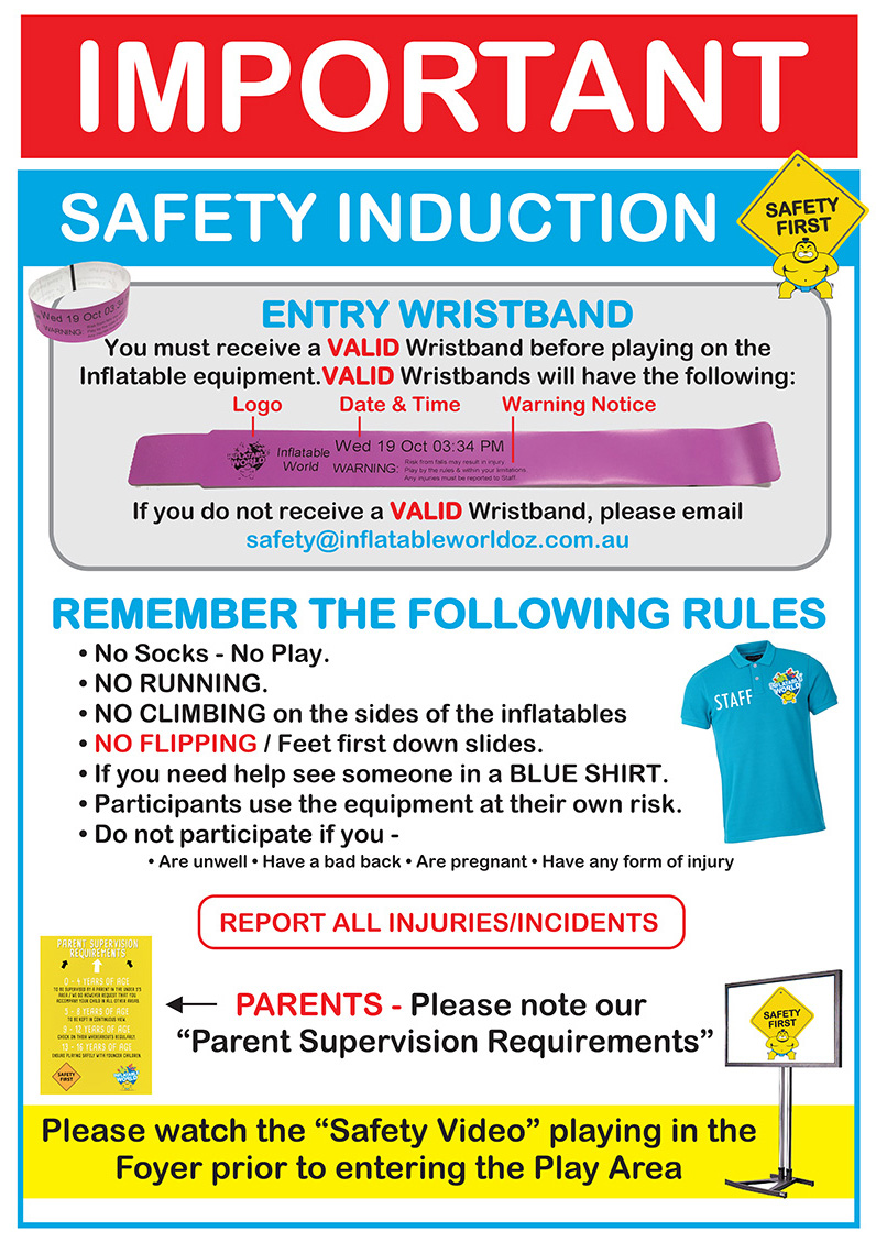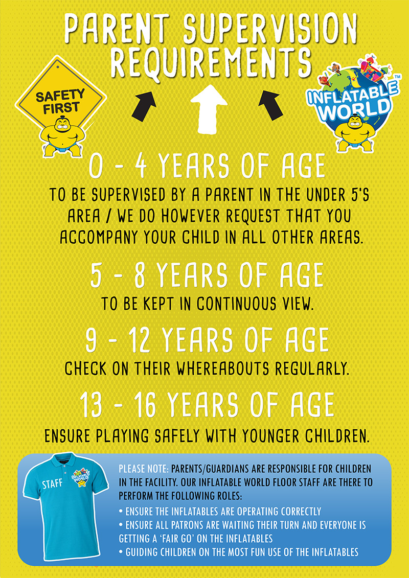 We ask for your assistance to keep your child safe by noting our Safety Induction prior to entering the play area and following the Parent Supervision Requirements. Whilst we have trained floor staff consistently monitoring the play area, it is the parents or guardian’s responsibility to monitor and supervise children’s behaviours and actions while playing. Inflatable World actively encourage parents to interact with their children during play. Remember it’s all about “Family Fun”.